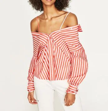 My favorite off the shoulder top of the season hails from Zara. Big surprise huh. Specifically, it's a convertible top that you can wear as a long sleeve top with bare shoulders or as a structured tank with an effortless wrap around look. I've seen this trend mainly on the high end fashion circuit, but Zara is the first brand I've seen do this at a reasonable price point. The one shown below is in a coral and white. However, I believe this version comes in a blue and white as well, which has turned out to be a staple colorway for the spring and summer seasons.