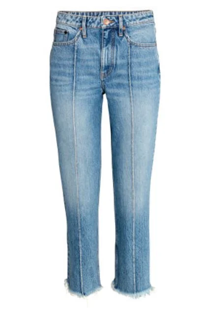 Believe it or not, my favorite place to buy denim jeans is H&M. Yes, you read that right. Now hear me out. Their premium denim that tops out around $40, is equivalent to high end denim brands in department stores and higher end boutiques. Truly. The quality is amazing and I've been really impressed with the fit. Now don't go into the store and try on the $9.99 and $19.99 jeans and think you are really doing something. Because I promise that you are not. However, for about $20 more, you will definitely find some edgier styles, treatments, and textures that will add some appeal to your current closet. I've also found myself gravitating more toward straight leg and wider leg cuts over skinny jeans this summer. Skinny jeans are still a relevant staple, but I will challenge you to step into some other styles that are much more current. Now if you must stick to skinny styles for some reason, try a pair with an uneven or a frayed hem to give the jean a tad bit more interest. Check out my favorite styles below from H&M.
